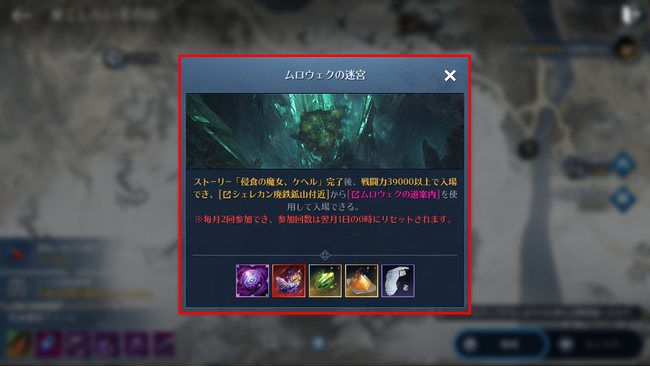 ストーリー「侵食の魔女、ケヘル」の依頼「ムロウェクの迷宮」を完了すると利用でき、ストーリー完了後にキャラクターレベル80以上、戦闘力39,000以上でアイテム「ムロウェクの道しるべ」を持っていると「ムロウェクの迷宮」へ入場できます。