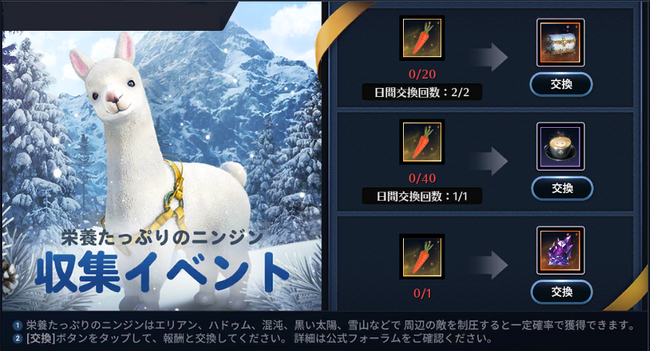 フィールド狩りを行うと、一定確率で「栄養たっぷりのニンジン」を獲得できます。獲得した「栄養たっぷりのニンジン」を利用し、イベントページにて「交換」ボタンをタップすると、特定のアイテムと交換することができます。詳しくは以下URLを参照ください。
