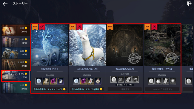 追加されたストーリーは「侵食の魔女、ケヘル」「太古が眠る安息所」「ふわふわのアルパカ!」「冬に似たトナカイ」 です。当該ストーリーを完了すると、果てしない冬の山の知識および称号を獲得でき、ストーリー「ふわふわのアルパカ!」「冬に似たトナカイ」を完了すると、雪山専用の搭乗物である「アルパカ」「アイストナカイ」を獲得できます。※これらのストーリーは、ストーリー「太古が眠る安息所」を完了すると進行できます。