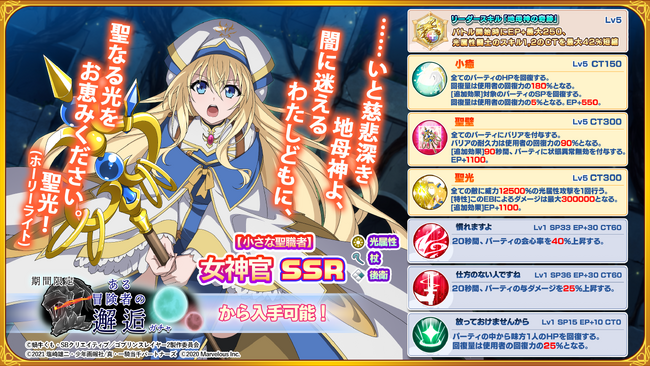 コラボ限定闘士「【小さな聖職者】女神官(SSR)」「【上の森人】妖精弓手(SSR)」は、他の同レアリティの闘士よりも高い確率で排出されます。