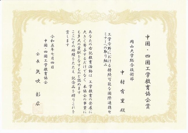 国立大学法人岡山大学(本部:岡山市北区、学長:那須保友)総合技術部教育支援技術課の中村有里技術専門職員が2023年7月4日、これまで工学部で実施してきた「工学分野における持続可能な国際連携セミナーへの取り組み」が評価され、「中国・四国工学教育協会賞」を受賞しました。