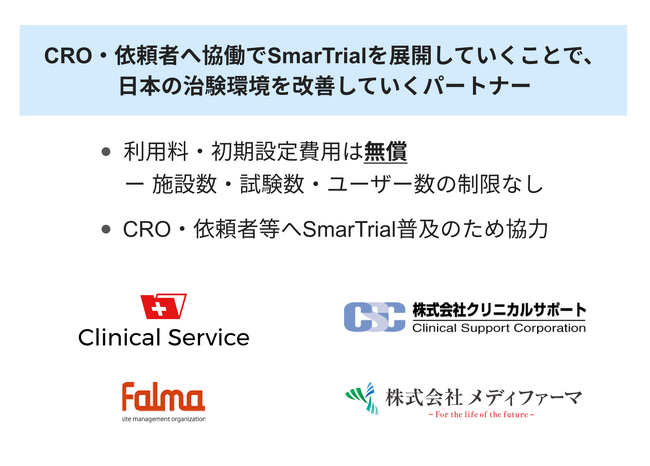 今回、日本の治験環境改善を加速させるべく、新たに治験実施医療機関およびSMO向けにSmarTrialを無償で利用できるパートナーシップ制度を開始しました。