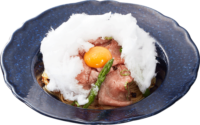 お皿いっぱいにのった、ふわふわのコットンキャンディに野菜だしを注ぐと、卵黄やアスパラなどの色鮮やかな具材が現れる新感覚の冷製パスタです。醤油ベースのパスタに、たっぷりのローストビーフや卵黄、コットンキャンディを組み合わせ、すき焼き風の甘辛いパスタに仕上げました。お好みで別添えの西洋わさびやブラックペッパーを加え、キレのある味わいへの変化をお楽しみください。