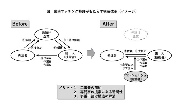 これらのシステムは発注者側と職人側ともに今抱えている問題を解決できるメリットがあり、発注者側は専門知識を要することなく適正価格にて直接職人とやり取りができ、職人側は下請けからの脱却や安定した仕事の確保にも寄与することになり、今回の特許取得技術を実装することで構造改革を加速化させることになります。