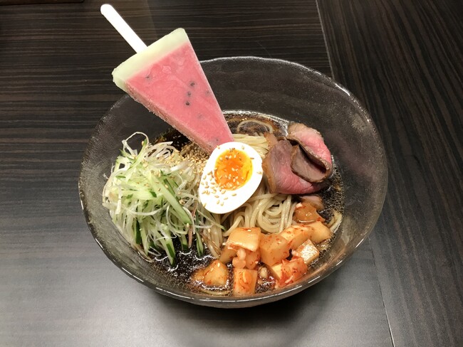 暑い夏の日にピッタリの冷やしラーメン。醤油ベースのスープには隠し味にバルサミコ酢を使いさっぱりと仕上げました。トッピングにはしっとりとした食感のローストビーフ、カクテキ、味玉、薬味を使用して、最後に大胆にもスイカバーをまるごとトッピング。