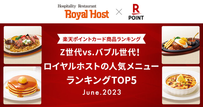 ロイヤルホールディングス株式会社(本社:福岡県福岡市、代表取締役社長:阿部 正孝)傘下で外食事業を担うロイヤルフードサービス株式会社(本社: 東京都世田谷区、代表取締役社長:生田 直己、以下ロイヤルフードサービス)と楽天ペイメント株式会社(以下「楽天ペイメント」)は共同で、「楽天ポイントカード商品ランキング」において「Z世代vs.バブル世代!ロイヤルホストの人気メニューランキングTOP5」を発表しました。