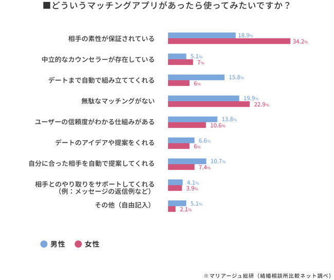 どんなマッチングアプリがあったら使ってみたいかを聞いたところ、女性は圧倒的に「相手の素性が保証されている」ことに需要があり、男性に約2倍の差をつけています。対して男性は、「デートまで自動で組み立ててくれる」が女性の2.6倍を記録し、実際に会うまでのコミュニケーションや段取りに関する要望が根強いです。