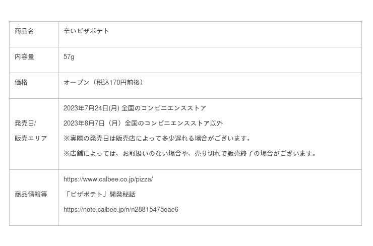 カルビー株式会社(本社:東京都千代田区、代表取締役社長:江原 信、以下、カルビー)は、濃厚とろ~りチーズとスパイスが効いたピザソースがくせになる厚切りポテトチップス「ピザポテト」シリーズより、辛ウマい味わいがやみつきになる『辛いピザポテト』を2023年7月24日(月)から全国のコンビニエンスストア先行で期間限定発売します。コンビニエンスストア以外の店舗では、2023年8月7日(月)から発売(2023年11月中旬終売予定)。