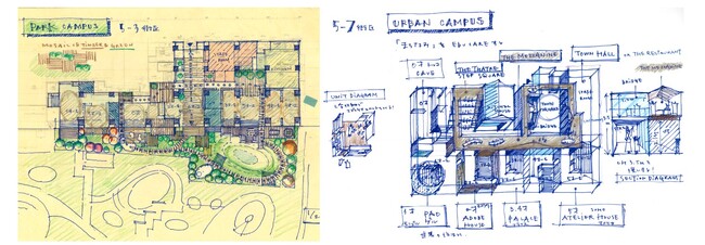 都心にいながら水辺に囲まれた場所 HARUMI FLAG に二つのナーサリースクールを設計させていただきました。このまち全体に広がるオープンスペースすべてを活動のキャンパスととらえ、(仮称)ポピンズナーサリースクールHARUMI FLAG PORT VILLAGEは、公園ランドスケープと一体的につながるPark Campus、(仮称)ポピンズナーサリースクールららテラス HARUMI FLAGは、都市のまちなみをそのまま延長して取り込んだUrban Campusとして、異なる二つのコンセプトを持たせています。