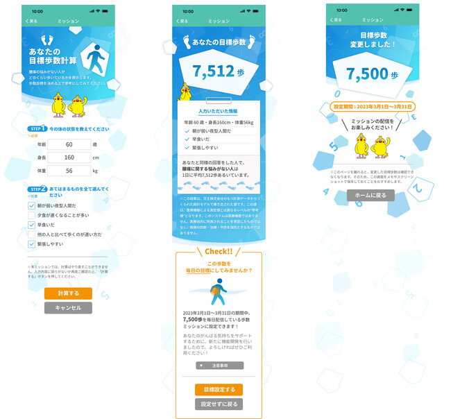 ドコモが提供する「dヘルスケア」は、毎日の歩数や体重を記録することができる他、アプリ内のミッションをクリアすると抽選でdポイントがたまるスマートフォン向け健康管理・増進アプリです。通常お客さまに対しては、一律で同じ歩数目標をアプリから提示していましたが、本実験では、「dヘルスケア」をご利用中で腰痛のお悩みを抱えるお客さまに対して、自分と同じ年齢・性別・身長・体重・生活習慣で、なおかつ腰痛のない人が毎日どの程度歩いているかを参考値として提示することで、「歩く意欲の変化」及び「歩数の変化」を検証しました。歩数の計算には、「仮想人体生成モデル(VITA NAVI)」を活用しました。