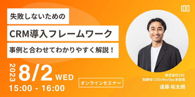 株式会社100(ハンドレッド)は、2023年8月2日(水)15時から「失敗しないためのCRM導入フレームワーク~事例と合わせてわかりやすく解説~」をテーマにオンラインセミナーを開催いたします。