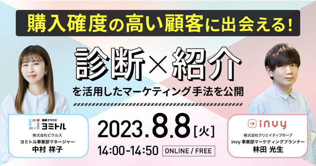 株式会社ピクルス(本社:東京都新宿区、代表取締役社長:田中 稔、以下「ピクルス」)は、株式会社クリエイティブホープさまと共催WEBセミナー「購入確度の高い顧客に出会える!「診断×紹介」を活用したマーケティング手法を公開」を2023年8月8日(火)に開催。