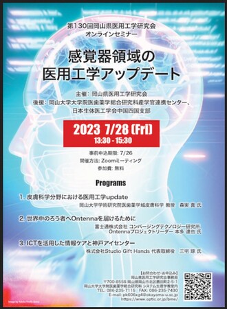 国立大学法人岡山大学(本部:岡山市北区、学長:那須保友)の大学院医歯薬学総合研究科産学官連携センターでは、日本生体医工学会中国四国支部とともに後援で岡山県医用工学研究会主催 第130回岡山県医用工学研究会・オンラインセミナー「感覚器領域の医用工学アップデート」を2023年7月28日(金)13:30~15:30にオンラインで開催します。
