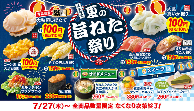 株式会社はま寿司(代表取締役社長:遠藤 哲郎 本社:東京都港区)が展開する100円寿司チェーン「はま寿司」は、7月27日(木)から、「はま寿司の夏の旨ねた祭り」を全国の店舗で開催します。
