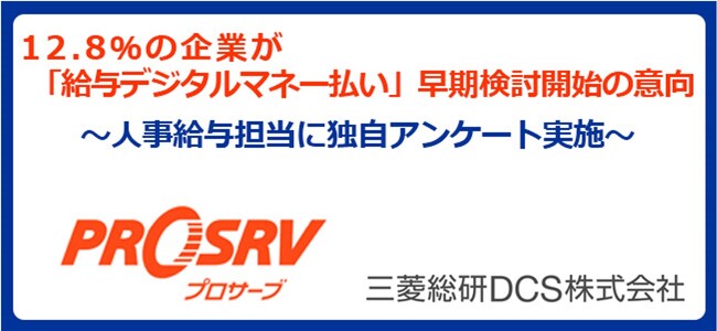 三菱総研DCS株式会社(本社:東京都品川区、代表取締役社長:松下 岳彦、以下DCS)は、DCSが提供するクラウド型人事給与システム「PROSRV on Cloud(プロサーブオンクラウド)」利用企業の人事給与担当者を中心に「給与デジタルマネー払い」に関する独自アンケートを実施しました。その結果、12.8%の企業が、給与デジタルマネー払い導入にむけ早期に検討を開始する考えを持っていることがわかりました。