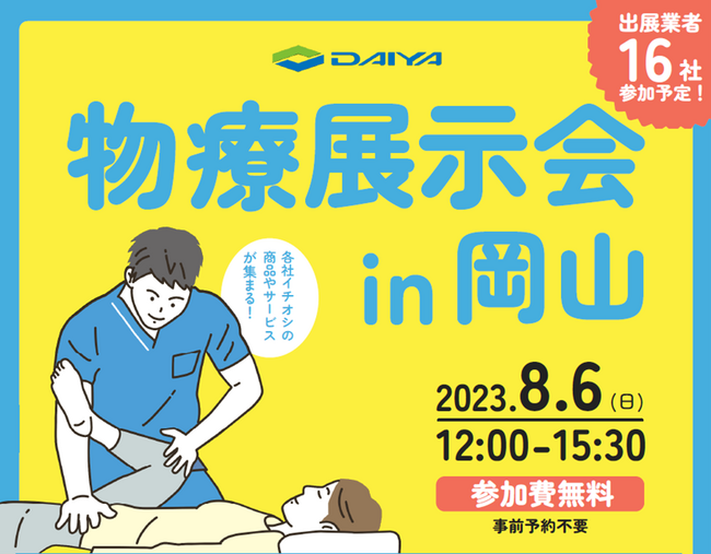 本展示会は、(公社)日本柔道整復師会 第46回中国学術大会 岡山大会の開催に伴って行われる医療用品の展示会です。全16社が出展し、各社イチオシの商品やサービスを展示いたします。事前予約が不要で、参加費も無料ですので、ぜひこの機会に来場をご検討いただけますと幸いです。