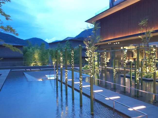 箱根・強羅 佳ら久では、これまでも奥深い箱根の魅力を感じる取り組みや情報発信をしてまいりました。このたび、「佳ら久」のシグネチャーテラスである「水のテラス」を活用し、地元の小田原や三島で親しまれている夏の風物詩「風鈴」を展示したギャラリーを開催いたします。水盤の中にある、四方を水に囲まれたベンチは記念撮影のスポットとしてもお楽みいただけ、夏の暑さが和らぐような空間となっております。夕暮れ時には、水鏡に映る宿の情景を愉しんだり、光の演出によって幻想的に変化するテラスでどこか懐かしさを感じながら散策することもおすすめです。
