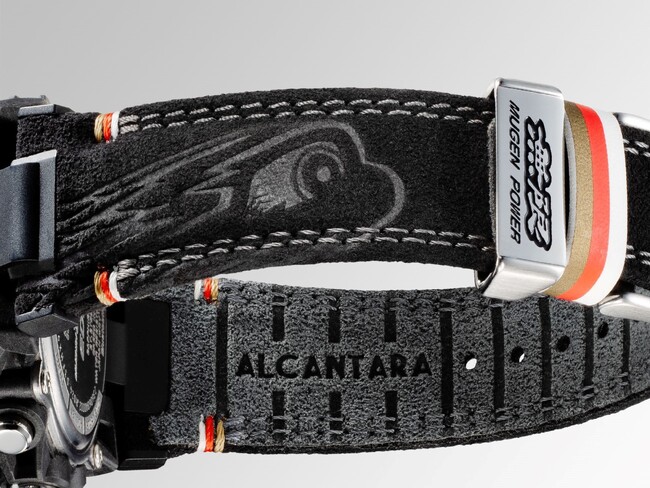 ケースはカーボンファイバー強化プラスチック製で、レーシングカーのサスペンションからインスパイアされた4本足のラグを備えているほか、文字盤とリングは「MUGEN」のコーポレートカラーであるホワイト、レッド、ゴールド、ブラックで彩られています。