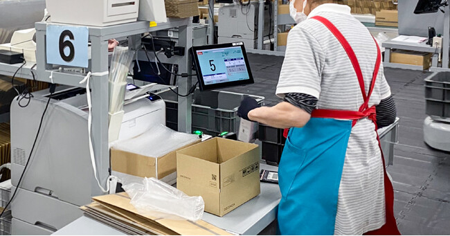 オルビスの物流拠点では、梱包担当者の手元のディスプレイに梱包サイズの情報を表示して、作業をサポートしています。本番環境では「Perswell」で算出した最適な梱包サイズを表示し、より精度の高い情報を担当者に共有します。さまざまなサイズが用意された梱包材から、迷うことなく最適サイズを選ぶことができ、熟練度に左右されず全ての担当者が効率的に作業することができます。