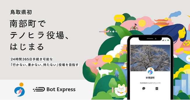 ほとんどの住民が、今、すぐに利用できるスマホ市役所「GovTech Express」を提供する株式会社Bot Express(本社:東京都港区、代表取締役:中嶋 一樹、以下 Bot Express)は、鳥取県南部町(町長:陶山 清孝)がGovTech Expressを活用し、南部町LINE公式アカウントから行政手続きが可能となる「テノヒラ役場」を7月26日に開設したことをお知らせいたします。GovTech Expressの活用は、鳥取県内で初となります。