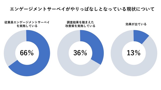 PwCコンサルティングの実施した調査によると、エンゲージメントサーベイを社内で実施した企業のうち、その後の改善のための施策を実行している企業は約半数にすぎないという現状があります。また、改善策を講じている企業の中でも、約3分の1の企業しかその効果を実感できていないようです。(下図)