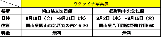 株式会社山田養蜂場(本社:岡山県苫田郡鏡野町、代表:山田英生)は、8月2日(水)~8月16日(水)の期間に鏡野町中央公民館、8月18日(金)~8月31日(木)の期間に岡山県立図書館にて、報道カメラマンの渋谷敦志氏が撮影したウクライナの現状を伝える写真展(一般公開)を行います。また、8月1日(火)には、鏡野中学校の生徒を対象として、写真展に加えて渋谷氏の講演会も実施いたします。