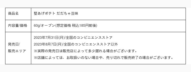 カルビー株式会社(本社:東京都千代田区、代表取締役社長: 江原 信)は、“噛むほどうまい!”堅い食感が人気のポテトチップス「堅あげポテト」より、47都道府県の「地元の味」をお菓子で再現する「(ハート)JPN(ラブジャパン)」プロジェクトで人気だった『堅あげポテト だだちゃ豆味』を2023年7月31日(月)から全国のコンビニエンスストア先行で期間限定発売します。コンビニエンスストア以外の店舗では、2023年8月7日(月)から期間限定発売します(2023年10月中旬終売予定)。