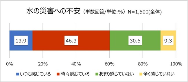 水の災害が起こることへの不安について聞いたところ、「いつも感じている」13.9%、「時々感じている」46.3%、「あまり感じていない」30.5%、「全く感じていない」9.3%で、「いつも感じている」と「時々感じている」を合わせた“不安を感じている人”が6割超(60.2%)となりました。