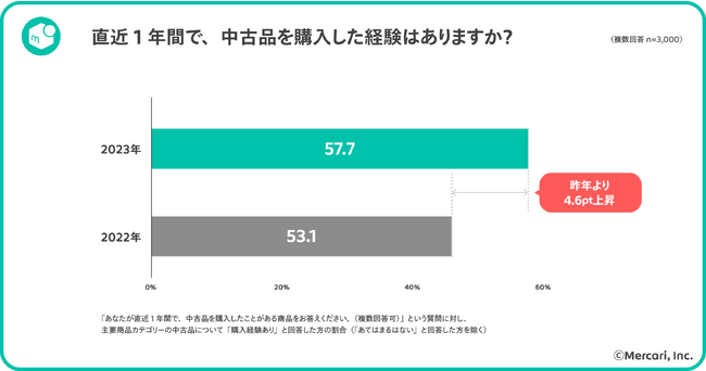 中古品の購買行動に関して、57.7%が「直近1年間で中古品を購入した経験がある」と回答(昨年対比+4.6pt)。商品カテゴリー別に見ると、「洋服」、「本・雑誌・漫画」が上位となり、それぞれ昨年対比約4pt上昇