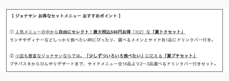 詳細URL:https://www.skylark.co.jp/jonathan/menu/summer_set/index.html