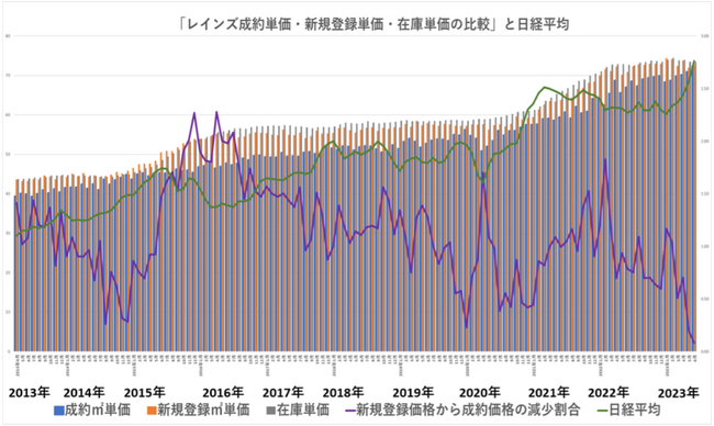 一方、日経平均株価と新規登録価格から成約価格の減少割合はほぼ反比例の動きをしています。このまま日経平均株価が上昇トレンドを描き続けるとすれば、新規価格と成約価格の差はさらに狭まり、限りなくゼロに近くなるものと考えられます。