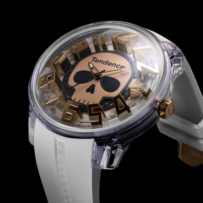 ロースゴールドのインデックス(数字)に、クリアケースとホワイトストラップを合わせた上品で爽やかなデザイン。中央にはアイコニックなローズゴールドのスカルがスピンします。