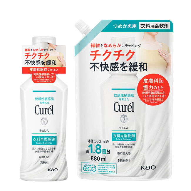 「Curel」初となるファブリックケアカテゴリー商品『キュレル 衣料用柔軟剤』は、肌への刺激ともなりうる衣類の摩擦を低減し、チクチクやゴワつきなどの不快感を緩和する柔軟剤です。