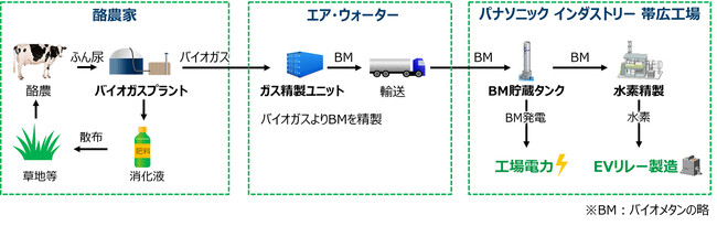 パナソニック インダストリー株式会社(本社:大阪府門真市、代表取締役 社長執行役員・CEO:坂本 真治、以下パナソニック インダストリー)とエア・ウォーター株式会社(本社:大阪市中央区、代表取締役会長・CEO:豊田 喜久夫、以下、エア・ウォーター)は、環境負荷低減と地域貢献を両立する地産地消のエネルギー活用モデルを構築します。なお、家畜ふん尿から製造したバイオメタン[1]を工場電力と製品材料に利用する取り組みは電機・デバイス業界内で初めて(※)となります。