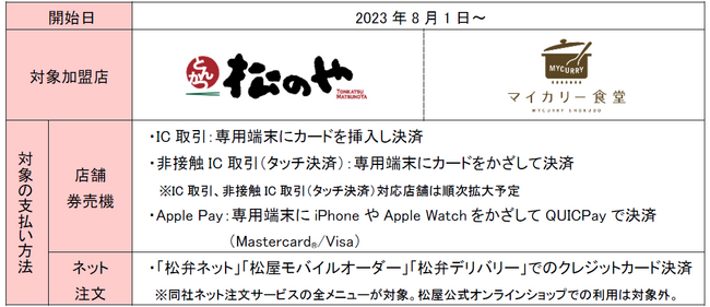 三菱UFJニコスはこの度、「三菱UFJカード」の利用で最大5.5%相当(※)のポイントが貯まる優遇サービスにて、株式会社松屋フーズ(本社:東京都武蔵野市、代表取締役社長:瓦葺一利)との提携を拡充、従来の対象店である牛丼チェーン「松屋」に、とんかつ専門店「松のや」とカレー専門店「マイカリー食堂」を追加し、8月1日に取り扱いを開始します。また同時に、同社のネット注文サービス「松弁ネット」「松屋モバイルオーダー」「松弁デリバリー」では、この“最大5.5%”を、既にその対象である「松屋」だけでなく、同社の他のブランド店での各ネット注文サービス対象メニュー(商品)にも拡大します。