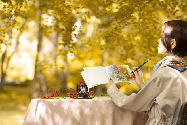 お持ち帰りいただけるスケッチブックと水彩毛筆ペン(ホテル貸出)がセットになったDrawing Setは、大人の塗り絵としても楽しめる仕様で、色をつけていくだけで気軽にアートをご体験いただけます。紅葉の季節はホテル周辺の紅葉・アートスポットをオンラインMAPでご紹介。スポットを巡り軽井沢の自然を感じながら、大人のアート体験をお楽しみください。