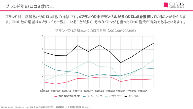 ブランド別・1店舗あたりの口コミ数の推移です。4ブランドの中でモンベルが多くの口コミを獲得していることが分かります。口コミ数の増減は4ブランドで一致していることが多く、そのタイミングを狙った口コミ施策が有効であるといえます