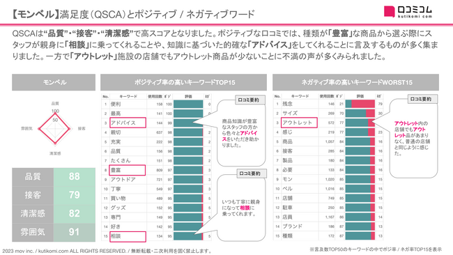 QSCAは“品質”・“接客”・“清潔感”で高スコアとなりました。ポジティブな口コミでは、種類が「豊富」な商品から選ぶ際にスタッフが親身に「相談」に乗ってくれることや、知識に基づいた的確な「アドバイス」をしてくれることに言及するものが多く集まりました。一方で「アウトレット」施設の店舗でもアウトレット商品が少ないことに不満の声が多くみられました。