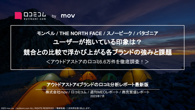 今回は、アウトドアストア4ブランド(モンベル / THE NORTH FACE / スノーピーク / パタゴニア)に寄せられた約6.6万件の口コミを調査、比較検証をしました。