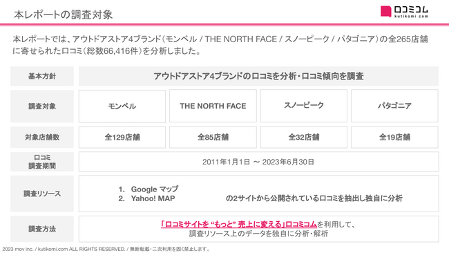 今回は、アウトドアストア4ブランド(モンベル / THE NORTH FACE / スノーピーク / パタゴニア)の全265店舗に寄せられた口コミ(総数66,416件)を分析しました。