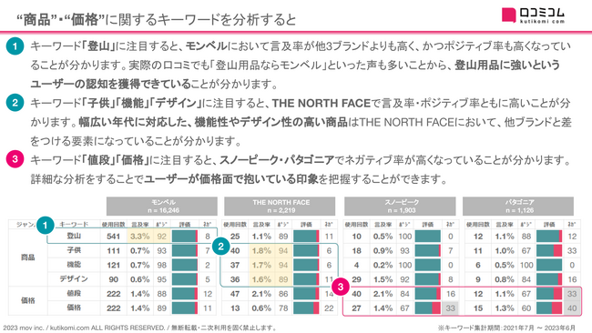 キーワード「登山」に注目すると、モンベルにおいて言及率が他3ブランドよりも高く、かつポジティブ率も高くなっていることが分かります。実際の口コミでも「登山用品ならモンベル」といった声も多いことから、登山用品に強いというユーザーの認知を獲得できていることが分かります。