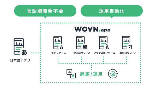 WOVN.app は、元となるアプリに SDK を導入するだけで簡単にアプリを多言語化できるソリューションです。言語別の開発が不要なだけでなく、運用時における翻訳・反映作業も自動化できるため、多言語アプリの開発・運用コストやリリースにかかるリードタイムを大きく削減できます。