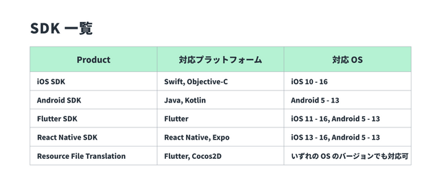 また、2023年7月13日から Flutter で開発されたアプリにも WOVN.app を導入できるようになりました。現段階で、6つの開発環境(Flutter、React Native、Swift、Objective-C、Java、Kotlin)に対応する SDK を提供しています。