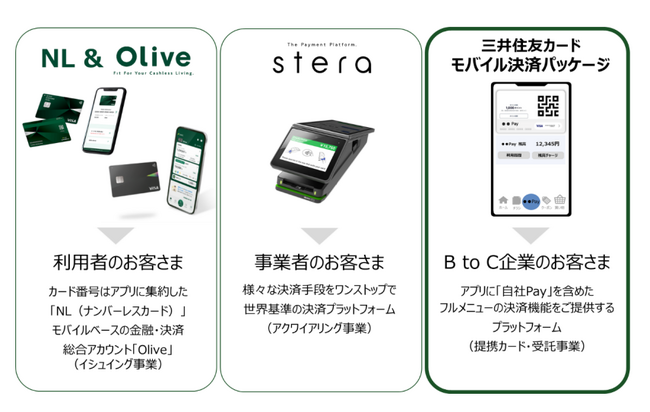 三井住友カードは、これまで利用者向けに、ナンバーレスカード、Vpassアプリの機能連動、モバイルベースの金融・決済総合アカウント「Olive」など次世代のサービスをいち早く提供し、事業者向けには、様々な決済手段をワンストップで対応することができるsteraシリーズを提供するなど、利用者・事業者双方にとって便利にキャッシュレスをご利用いただけるプラットフォーム(決済環境)を整備してまいりました。「三井住友カード モバイル決済パッケージ」は、三井住友カードが持つカード発行事業や加盟店事業の様々な機能やサービスと連携した B to C企業向けの新サービスです。