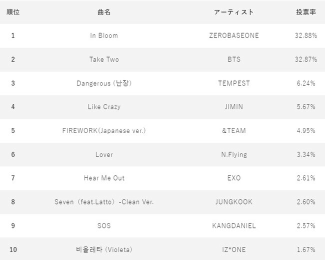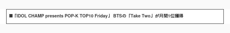 『IDOL CHAMP presents POP-K TOP10 Friday』7月の放送回の総合投票数で決まる月間1位はBTSの「Take Two」となり、7月のMVPとして番組内で放送されました。 「IDOL CHAMP」のファン投票では表示の結果となりました。