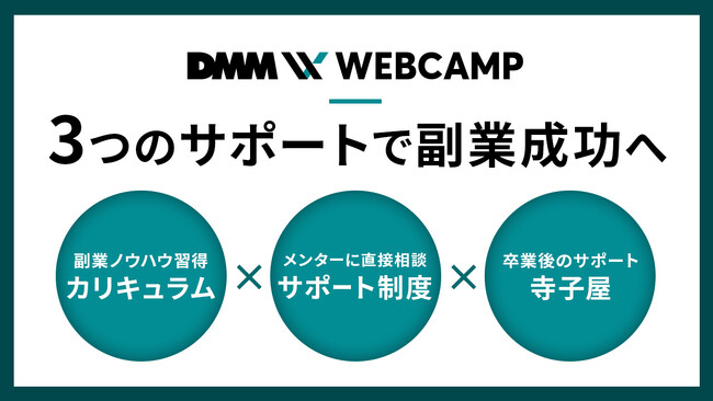 DMM WEBCAMPではこの需要の高まりを受け、副業案件の獲得・継続をしていくための副業サポートサービスをリニューアルします。3つのサポート体制により、副業獲得に向けての基礎知識の習得から、副業案件獲得、または副業案件獲得後に生じる実務における悩みのサポートを実施します。