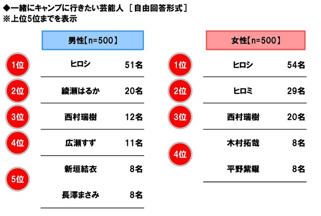 一緒にキャンプに行きたい芸能人 男女とも1位は「ヒロシさん」、女性回答の2位は「ヒロミさん」
