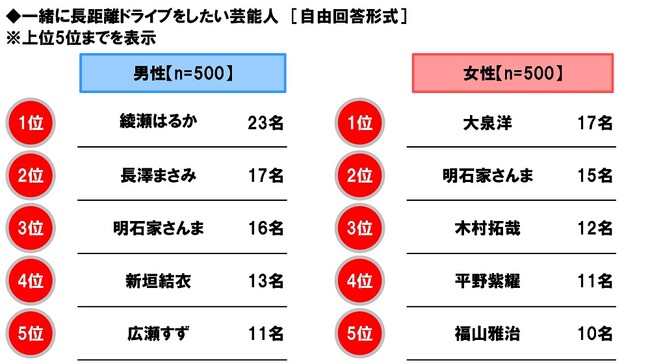 一緒に長距離ドライブをしたい芸能人 男性回答1位「綾瀬はるかさん」、女性回答1位「大泉洋さん」