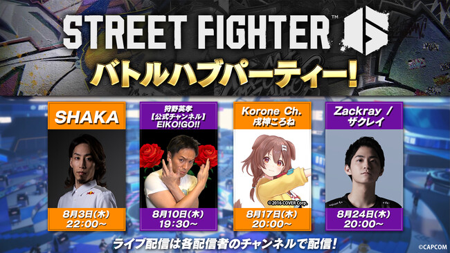 8月3日(木)より『ストリートファイター6』好きの人気配信者であるSHAKAさん、狩野英孝さん、戌神ころねさん、ザクレイさんによる「バトルハブパーティー!」が開催決定! 各配信者のチャンネルでライブ配信するので、是非「バトルハブパーティー!」に参加してみよう!