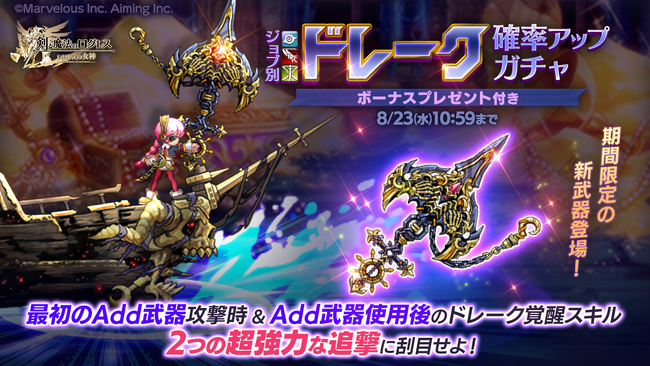 株式会社マーベラス(代表取締役社長:佐藤 澄宣/所在地:東京都品川区)は、スマートフォン向け本格オンラインRPG『剣と魔法のログレス いにしえの女神』において、2023/8/1(火)に期間限定の新武器を追加した「ジョブ別 ドレーク確率アップガチャ」の販売、2023/8/2(水)に「ジョブ別 マルドゥーク/ムラマサ&ステラマリス確率アップガチャ」の販売、および「キャプテン オブ パイレーツ」のクエスト追加などを含むアップデートを行ったことをお知らせいたします。